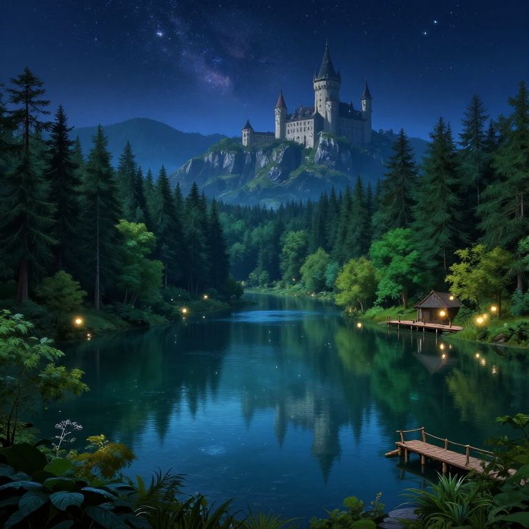 Photorealistic digital artwork of a serene nighttime scene featuring a reflective lake surrounded by dense, dark green pine trees. A majestic, castle-like structure with three tall spires sits atop a rugged, forested hill in the background. The sky is a deep, starry blue, with a visible Milky Way. Warm yellow lights from a small wooden dock and a nearby structure reflect on the calm water. The dock is positioned in the lower right corner, with lush vegetation framing the foreground. The overall mood is tranquil and magical.