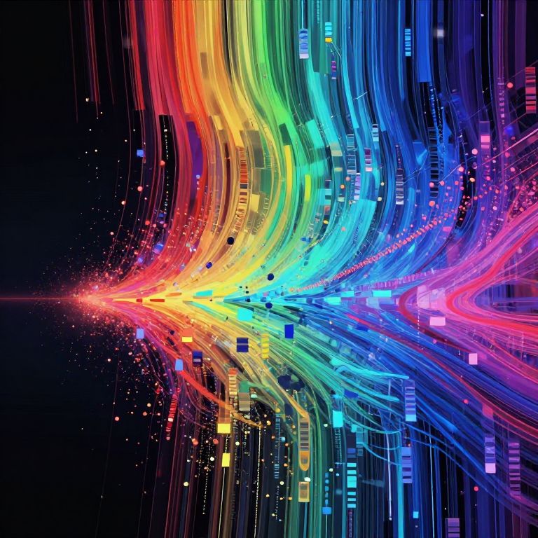 Digital art of vibrant, rainbow-colored, wavy lines and neon lights against a black background, resembling a cosmic or digital energy burst.