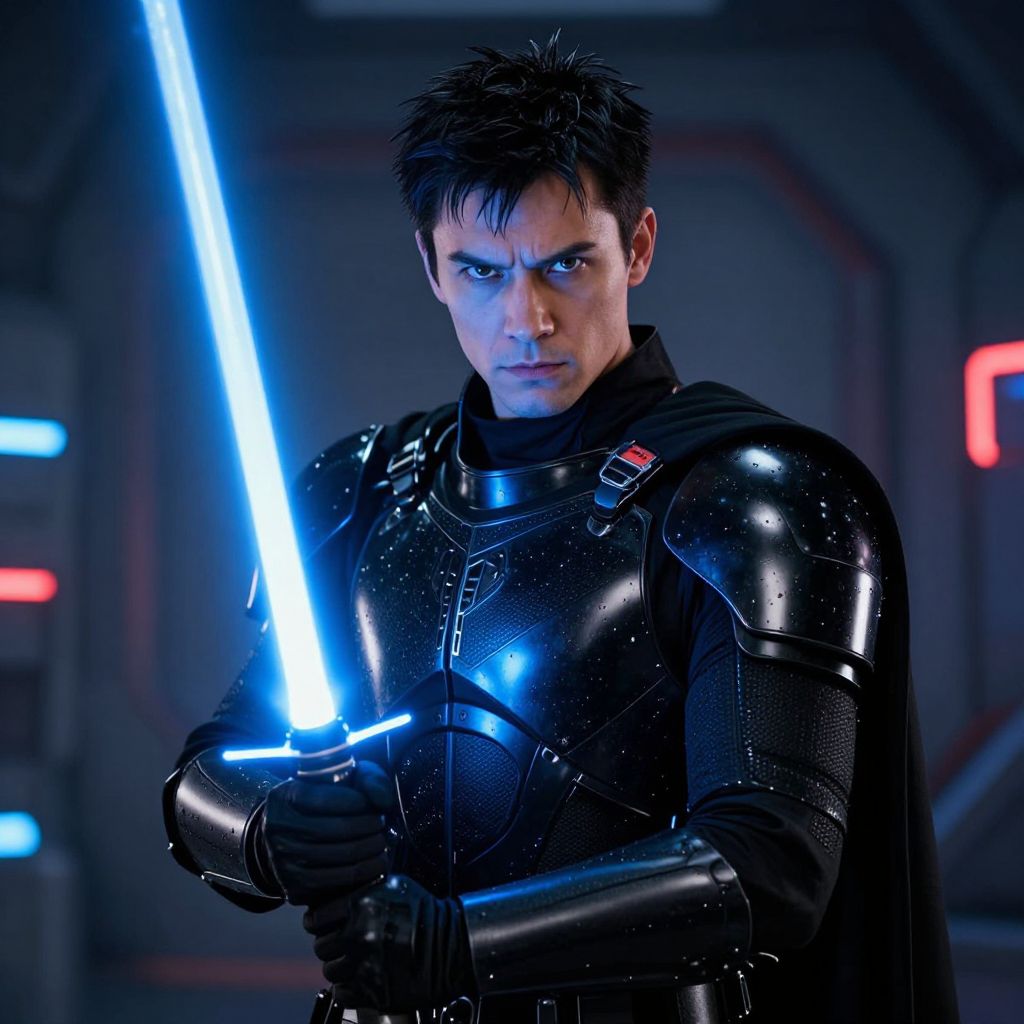 Photograph of a young white man with short, spiky black hair, intense blue eyes, and a serious expression, holding a glowing blue lightsaber in his right hand. He is dressed in a shiny, black, futuristic armored suit with a high collar and a black cape. The background is a dark, sci-fi setting with blue and red neon lights. The image has a high-contrast, cinematic style, emphasizing the glowing lightsaber and the reflective texture of his armor.