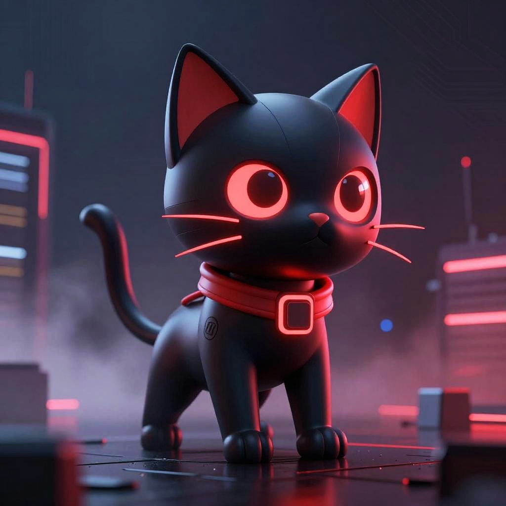 3D android assassin cat, rendered in a futuristic neon theme within neon-drenched city rooftops under electric fog, glowing edges and dynamic reflections, dark abstract background with subtle geometric patterns, high-poly hard-surface detail, calibrated color grading, volumetric fog, rim lighting, soft bloom, global illumination, ambient occlusion, reflective wet floor, ultra sharp microdetail, octane/unreal look, accented by glowing crimson and stealth black, depth of field, noise-free finish