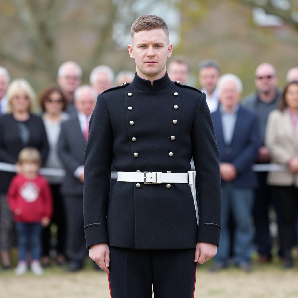 Photograph of a young, fair-skinned man in a black military-style uniform with white buttons and belt, standing in front of a blurred crowd outdoors