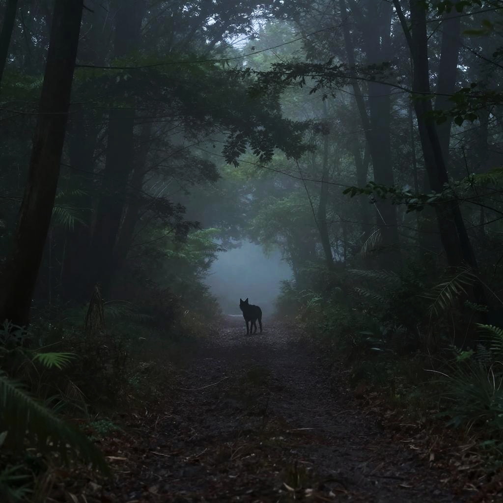 Misty dark forest scene, narrow path disappearing into deep fog, silhouette of a lone wolf in the distance, ethereal light filtering through dense foliage, fantasy art style