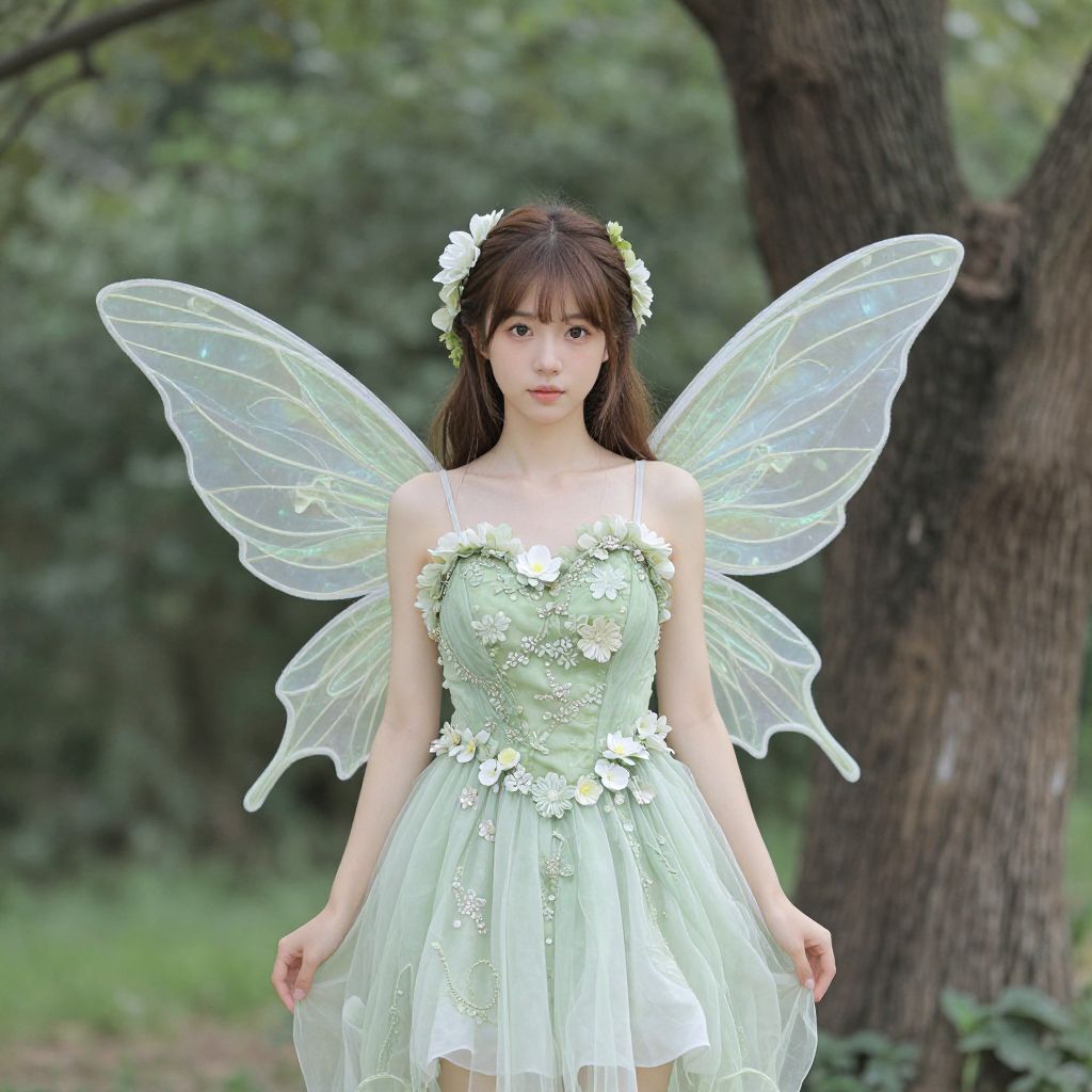 Photograph of a young Asian woman with fair skin standing in a forest. She has long brown hair adorned with a white flower crown and wears translucent, fairy-like wings. Her dress is a light mint-green, strapless, with a fitted bodice embellished with white floral appliqués and a tulle skirt. The background is blurry with green foliage and a large tree trunk on the right. The overall style is whimsical and ethereal, evoking a fairy tale-like fantasy. The woman's expression is calm and slightly curious.