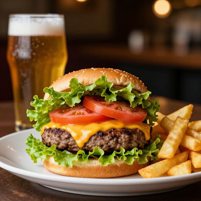 Lush green lettuce wraps around a double-patty cheeseburger topped with vibrant tomato slices, served alongside golden fries on a white plate, complemented by a frothy pint of amber beer in a glass, all set against a softly lit background with warm bokeh lights.
