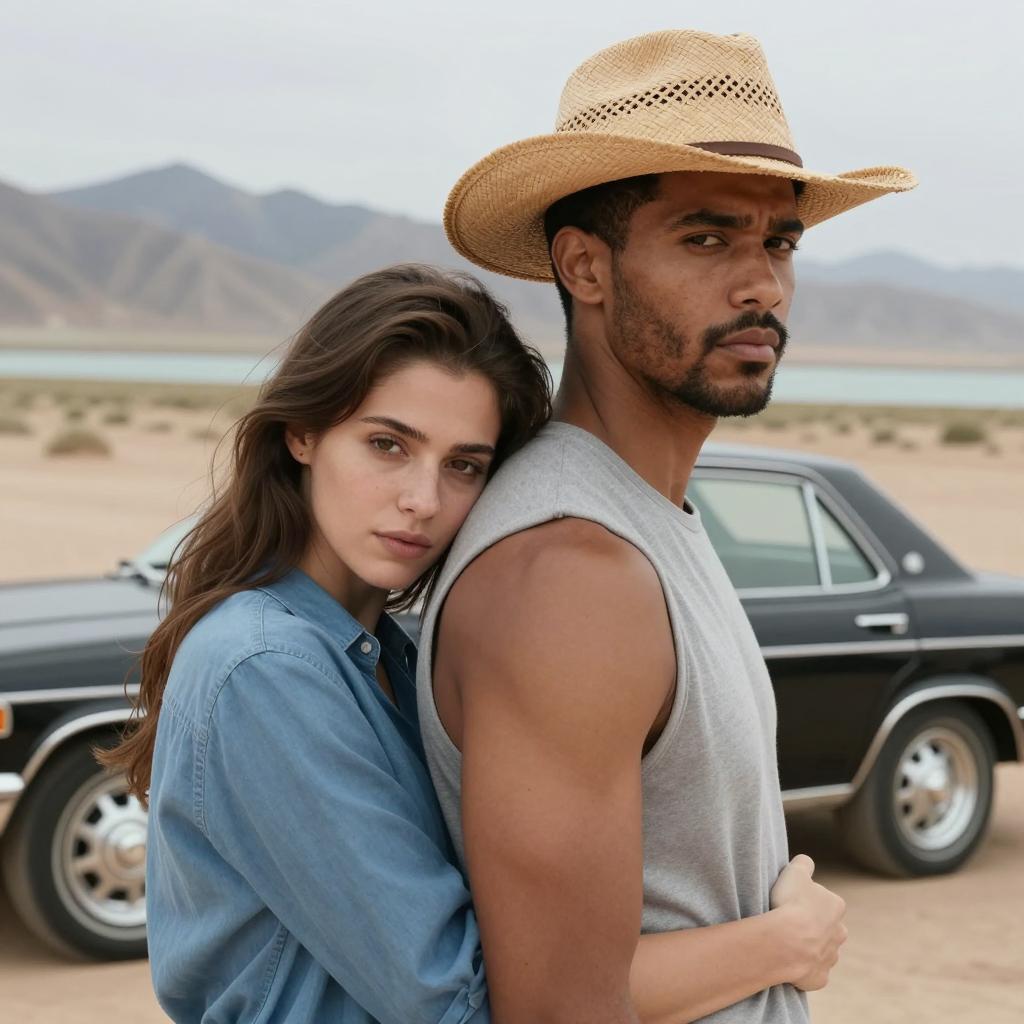 Two people sitting on a rocky cliff. Man with short dark hair, blue striped shirt, beige pants, left arm resting on knee, looking right. Woman with curly brown hair, red and black floral shirt, black pants, right arm resting on knee, looking forward. Desert landscape in background. Bright daylight.