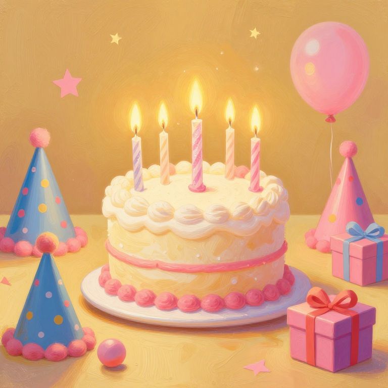 Birthday theme background with a whimsical cake centerpiece surrounded by glittering candles, a mix of party hats and gift boxes scattered around, warm golden hues infused with bright pinks and blues, designed in a detailed painterly style.