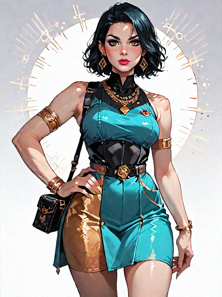Full body digital illustration of a glamorous woman with short black hair and green eyes wearing a sleeveless metallic knit top and matching asymmetrical skirt with a thigh-high slit. The outfit features gold and charcoal hues with metallic textures. She accessorizes with a chunky gold statement necklace, gold arm cuffs, and a black clutch bag with gold accents. The background includes a circular design with symbolic markings, enhancing the elegant and powerful vibe.