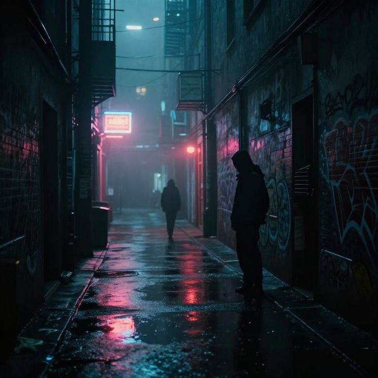 Stank, a mysterious urban alley at night filled with fog and dim neon lights reflecting off wet pavement, graffiti-covered walls, and a shadowy figure lurking, atmospheric and gritty, cinematic lighting, cyberpunk style