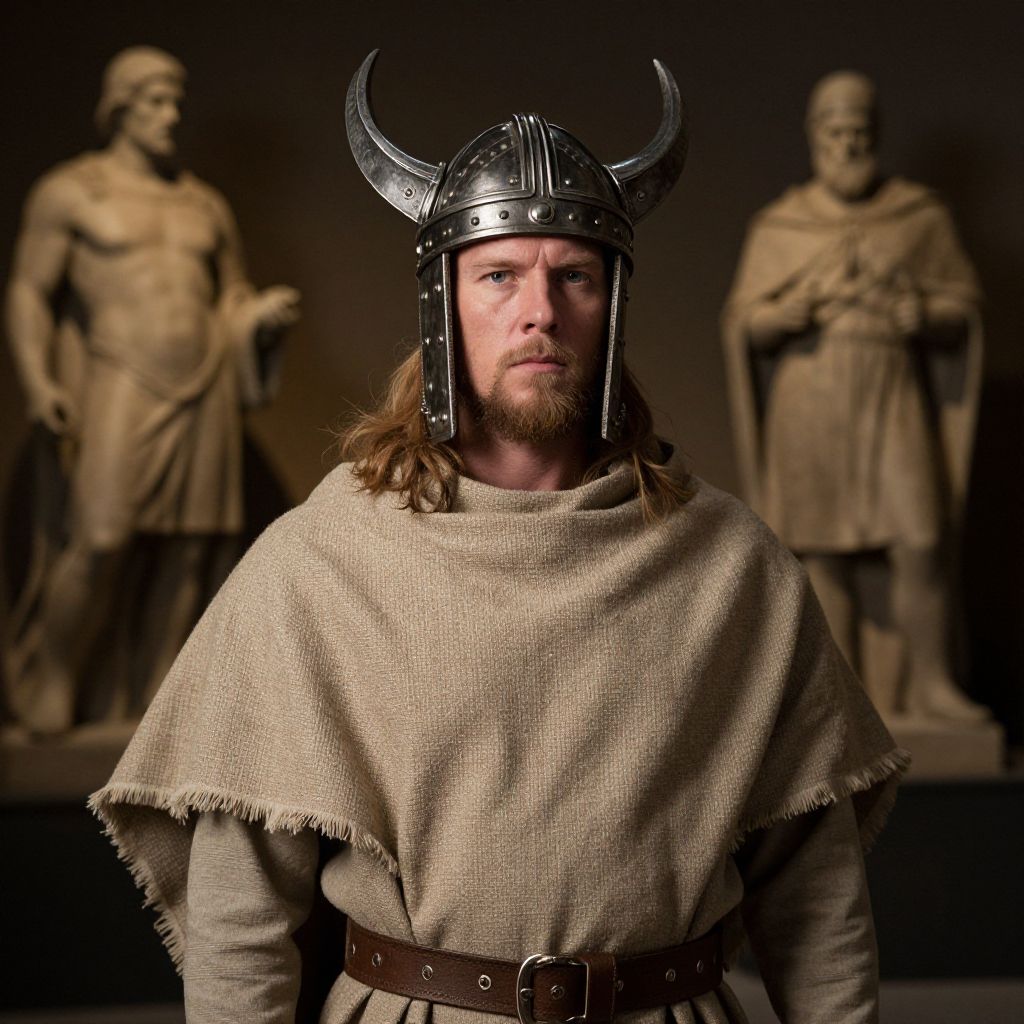A man in a traditional Viking helmet and draped in a cloth, standing in front of two statues, with a dramatic lighting setup.