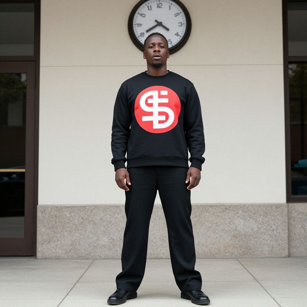 Photograph of a Black man standing in front of a beige building with a white clock showing 10:10. He has a medium build, short hair, and is wearing a black sweatshirt with a large red circle containing a white pound symbol (£) on the chest, paired with black pants and black shoes. His expression is neutral. The background includes a large window on the left and a glass door on the right. The ground is light gray stone tile. The image has a slight digital effect with a subtle glow around the subject.