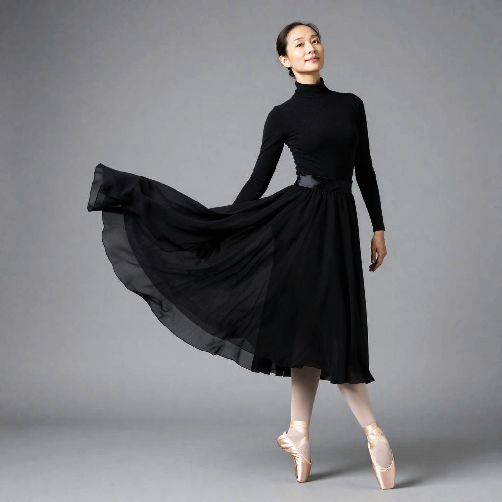 Black skirt outfit, worn by retired ballet dancer, featuring soft flowing layered chiffon black skirt with a fitted turtleneck, satin wrap belt, delicate ankle ribbons and vintage ballet flats, in charcoal black with soft blush and pearlescent ivory accents.