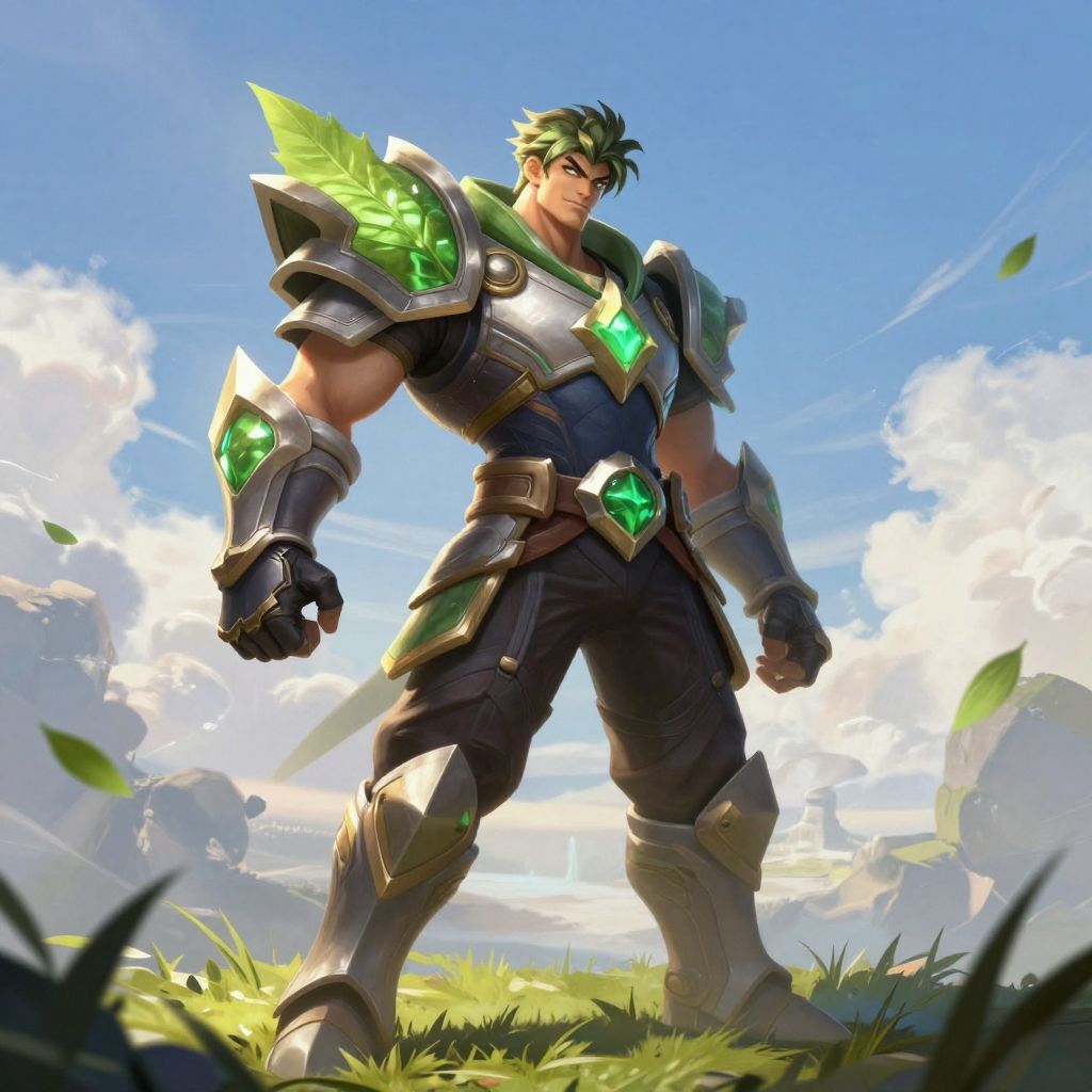Digital artwork of a futuristic, armored warrior with glowing blue energy on chest and sword, mid-attack in a sunny, grassy field.