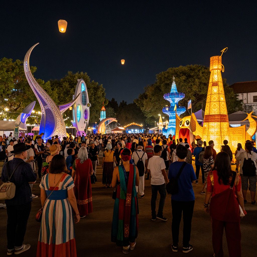 Generacion as a themed festival scene where people of all ages celebrate their heritage and future, colorful costumes, floating lanterns, futuristic decorations blending with traditional motifs, soft lighting with a magical and hopeful ambiance