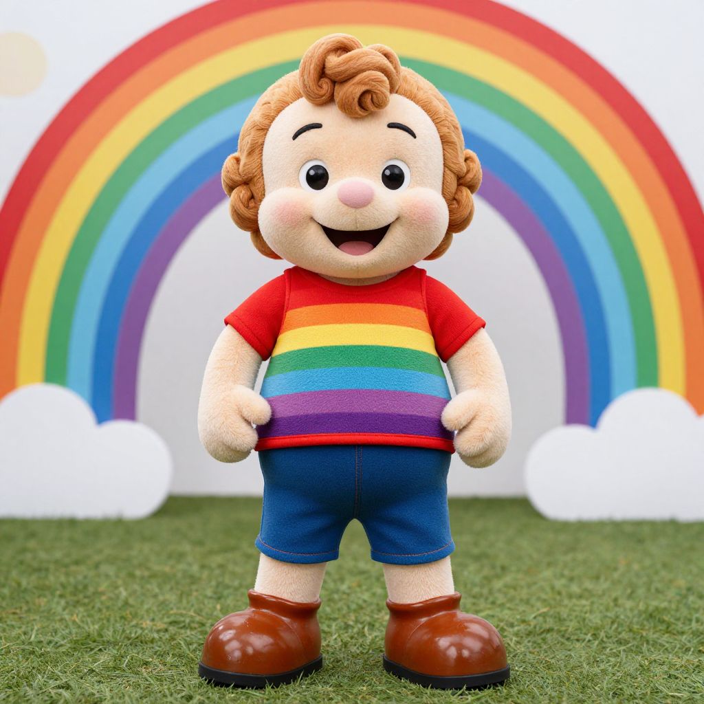 Rainbow Brite Adult, dressed in a rainbow outfit standing in front of a rainbow arch