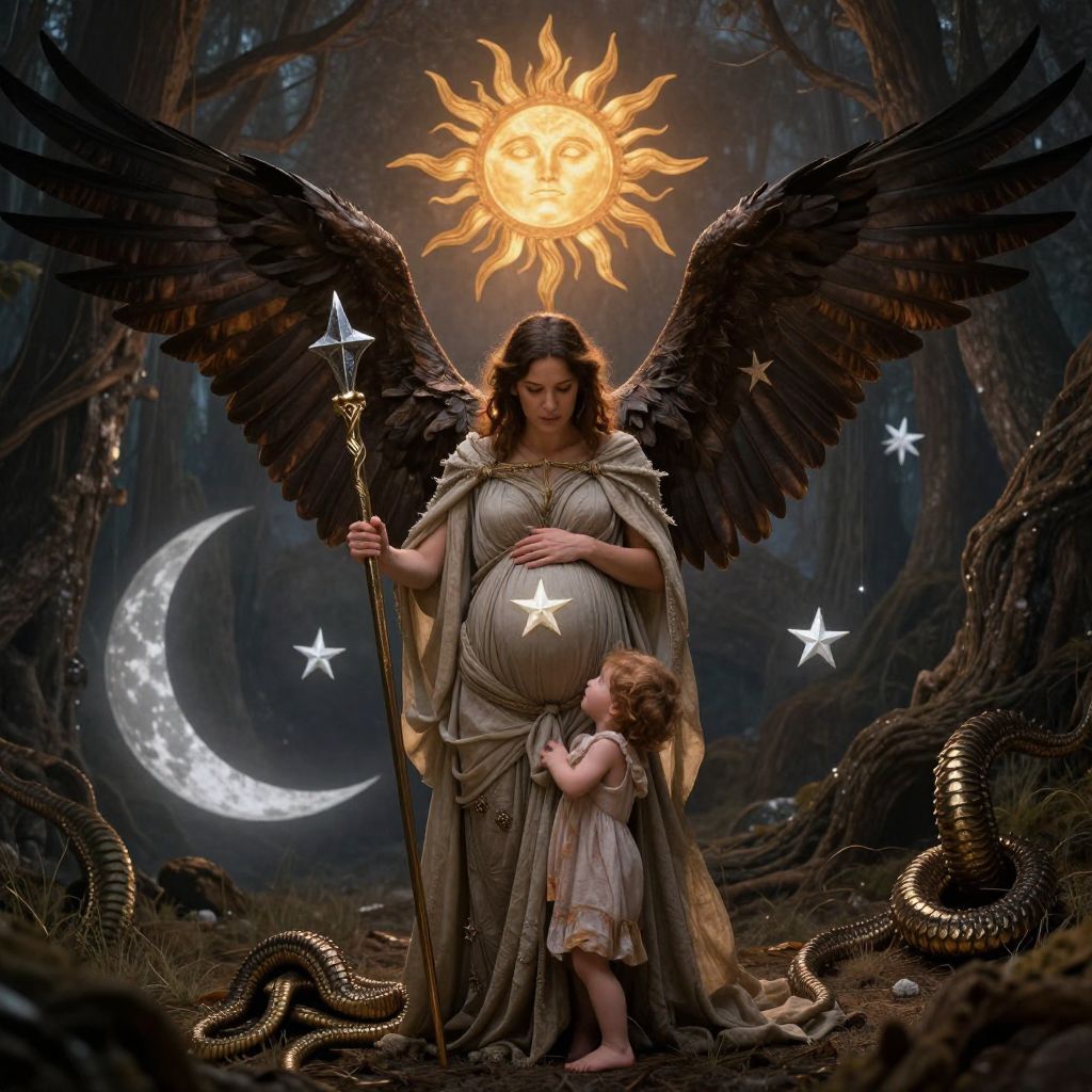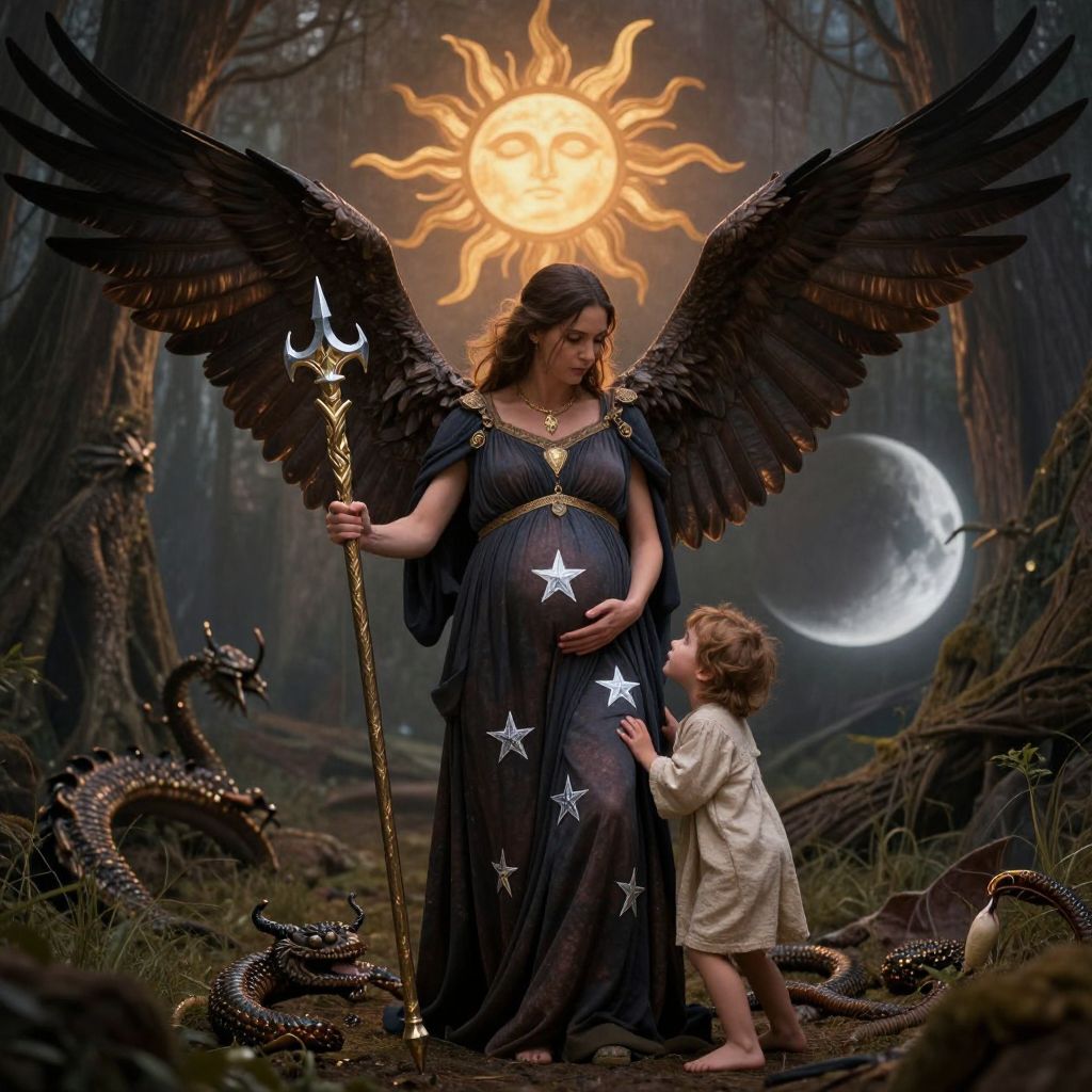 Digital fantasy artwork: Pregnant angelic woman with black wings, stars on dress, holding staff, stands before sun and moon, young boy touches her