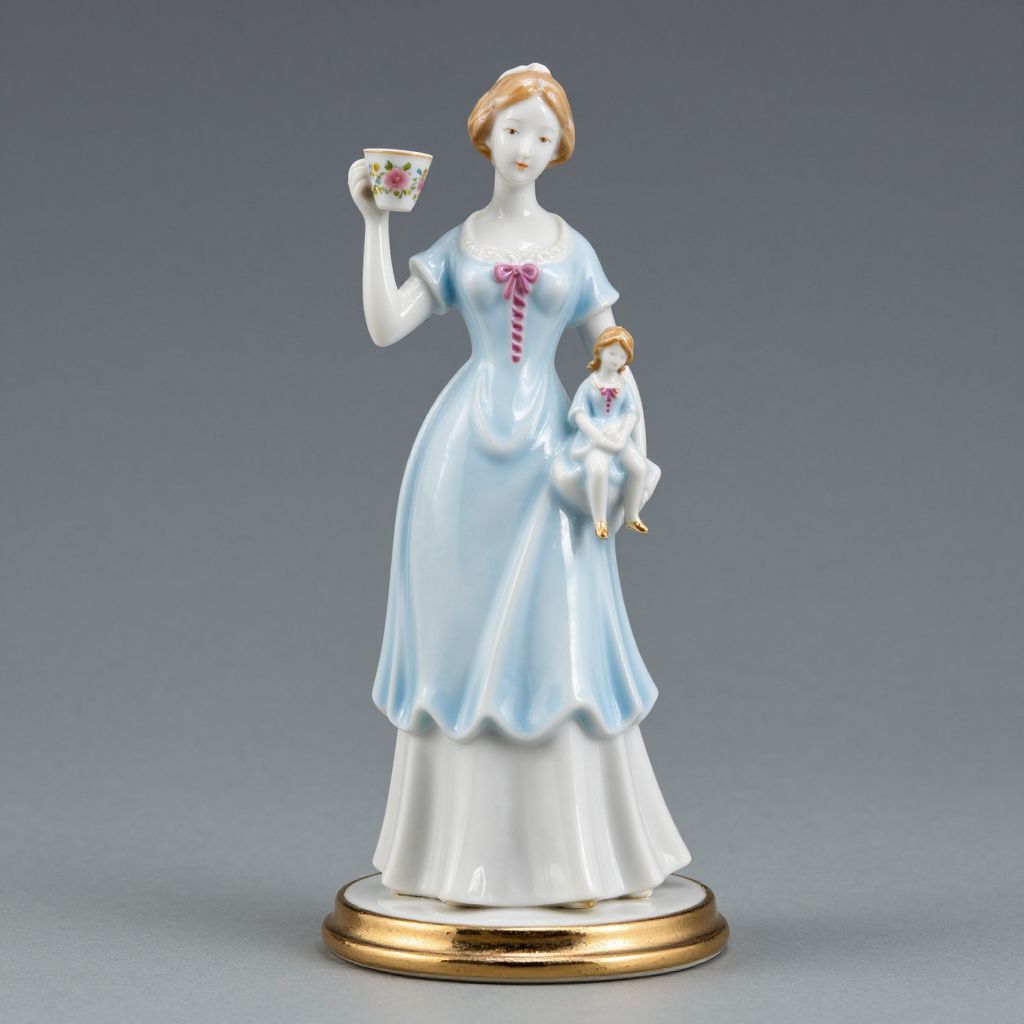Elegant porcelain figurine of a woman in a light blue dress and white skirt, holding a floral-patterned cup in her right hand and a small seated figure in her left, standing atop a circular base with a gold rim.