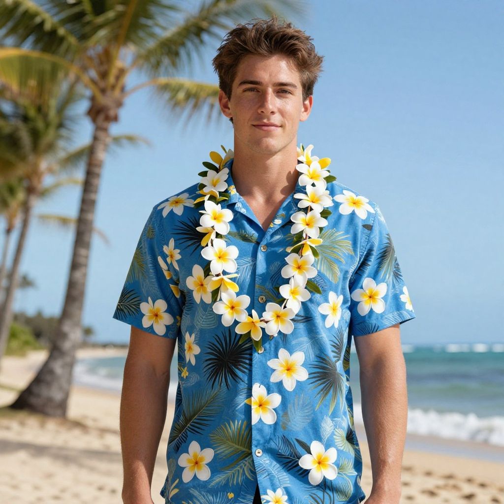 A young man stands on a tropical beach wearing a vibrant blue Hawaiian shirt adorned with white and yellow plumeria flowers, complemented by a traditional flower lei around his neck. The scene captures the relaxed, cheerful spirit of modern Hawaiian fashion against a backdrop of palm trees, clear skies, and gentle ocean waves.