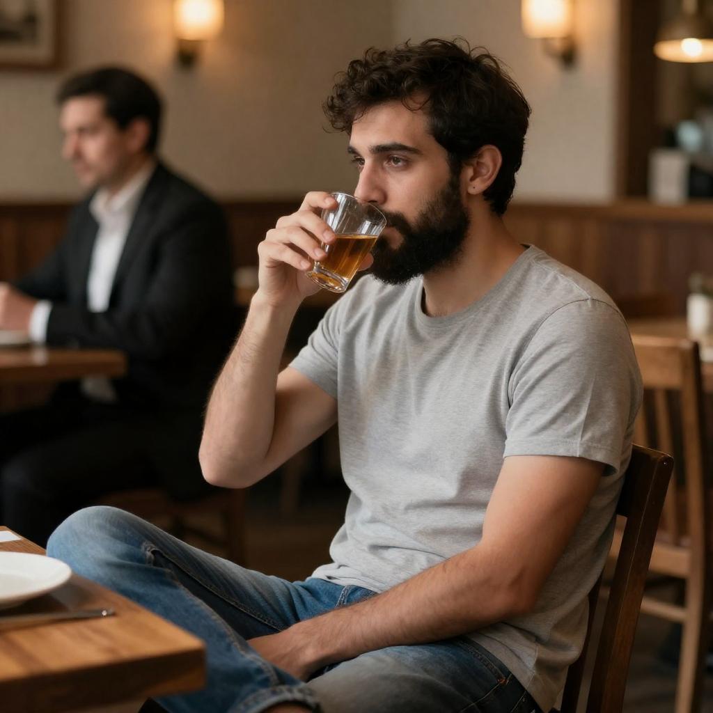 Photograph of a bearded man with dark hair, wearing a light gray t-shirt and blue jeans, sitting alone in a dimly lit wooden restaurant. He holds a glass to his mouth, looking contemplative. Background shows another man in a black suit blurred in motion, wooden chairs, tables, and warm lighting.