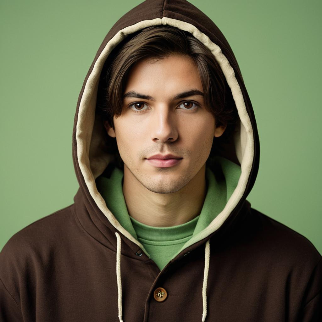 Photorealistic image of a young man with light skin and brown hair, wearing a green t-shirt and green pants. He is standing straight with a neutral expression in front of a large pile of green cucumbers with varying sizes and shades. The setting is outdoors with natural light and a simple background, emphasizing a green color palette with casual clothing and slight surrealism due to cucumbers attached to his outfit.