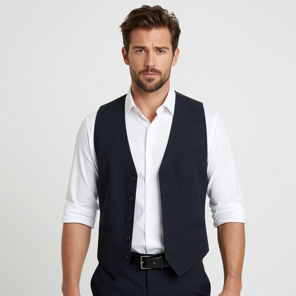 Photograph of a handsome Caucasian man with short, dark brown hair and a well-groomed beard. He has blue eyes and a serious expression. He is wearing a white dress shirt with rolled-up sleeves, a black vest with button details, and black pants with a black belt. The background is completely white, making the subject stand out. The lighting is bright, highlighting his features and attire. The style is modern and professional, suitable for a business or fashion context.