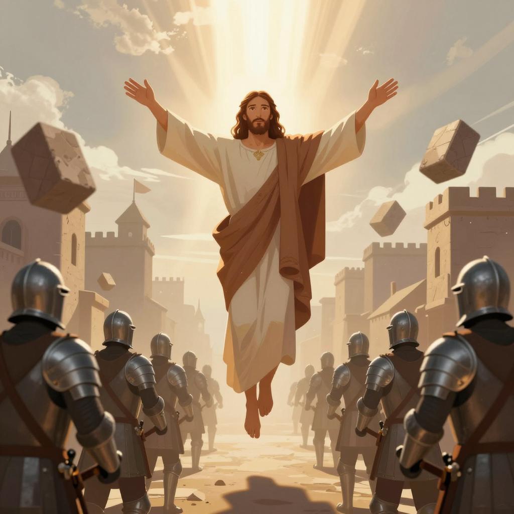 A stylized digital illustration depicting Jesus Christ ascending with open arms amidst armored soldiers in a medieval city setting. Divine rays of sunlight break through the cloudy sky, illuminating the scene and floating stone blocks surround the figures, evoking a sense of power and calm in conflict.