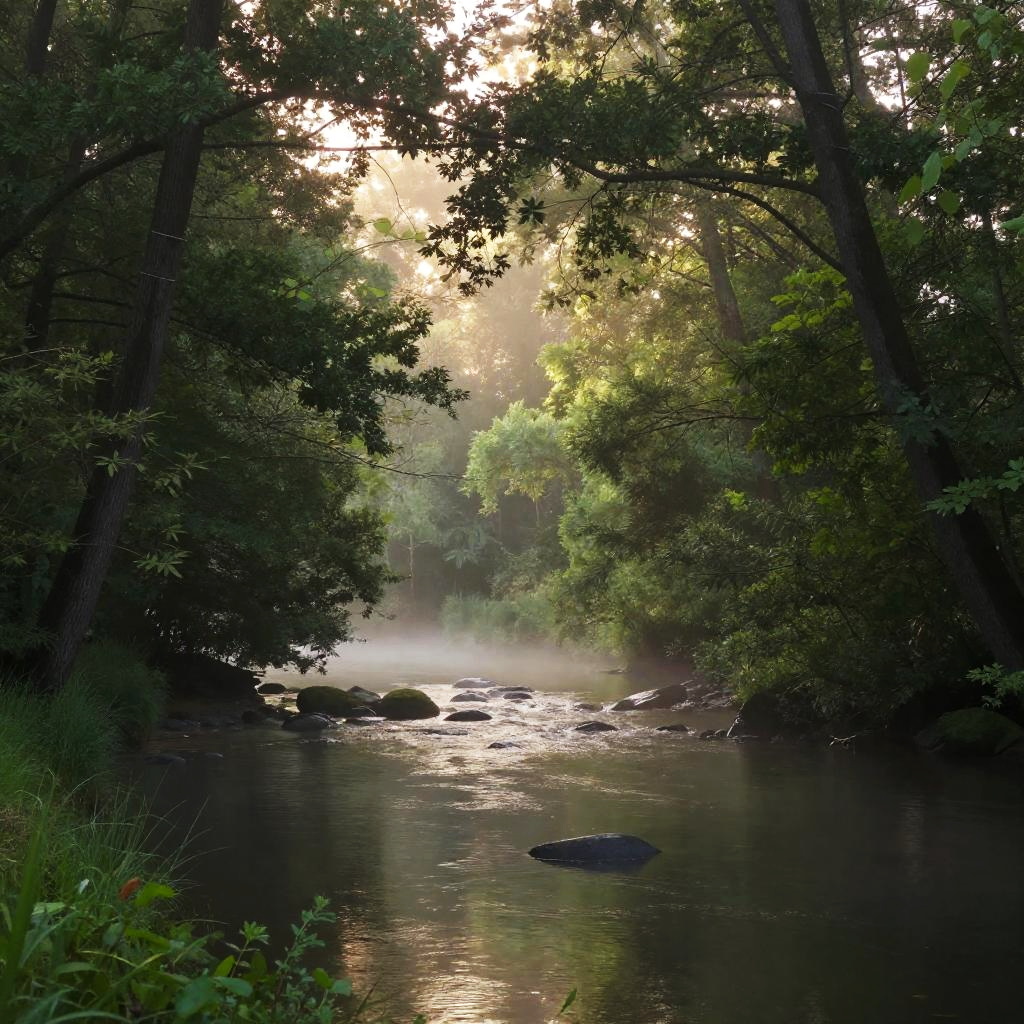 Fotographie of a serene forest scene at dawn, delicate mist hanging over a river, with vibrant greens and soft golden light filtering through the trees, evoking a peaceful, tranquil mood with photorealistic detail and natural beauty.