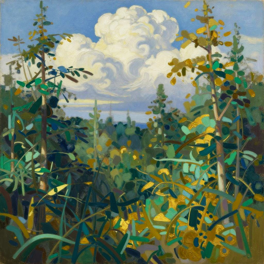 A painting by Helen Frankenthaler of an abstract woodland scene with translucent layers of emerald and gold. Bright sunny day with dramatic white cumulonimbus clouds building in the distance, intricate and hyper-realistic
