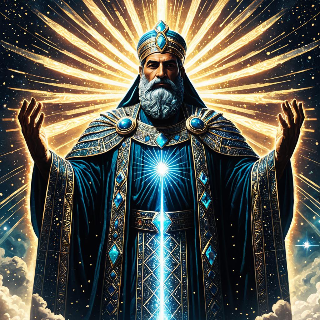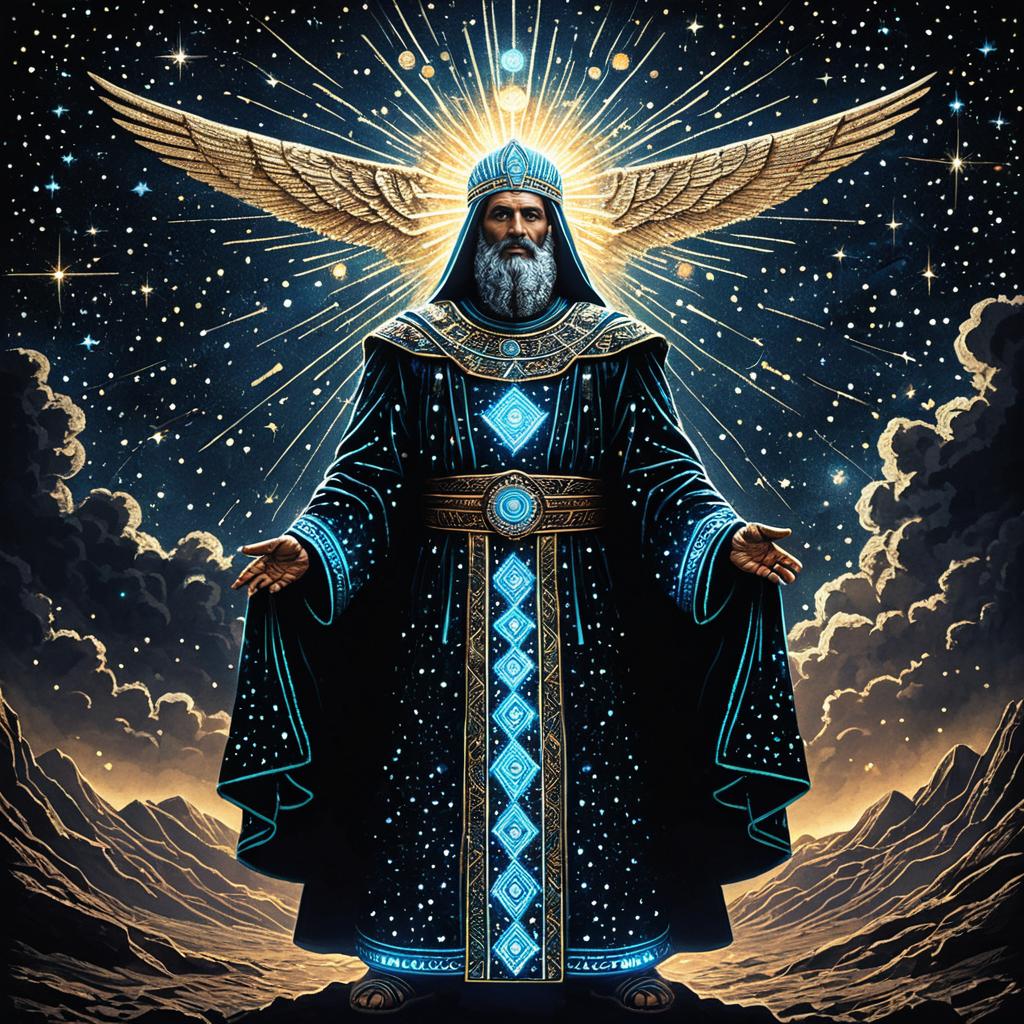 Anu – Sky father and supreme god of Mesopotamia, radiating power and clad in shimmering crystal-threaded divine robes, surrounded by glowing divine energy in a dramatic fantasy illustration