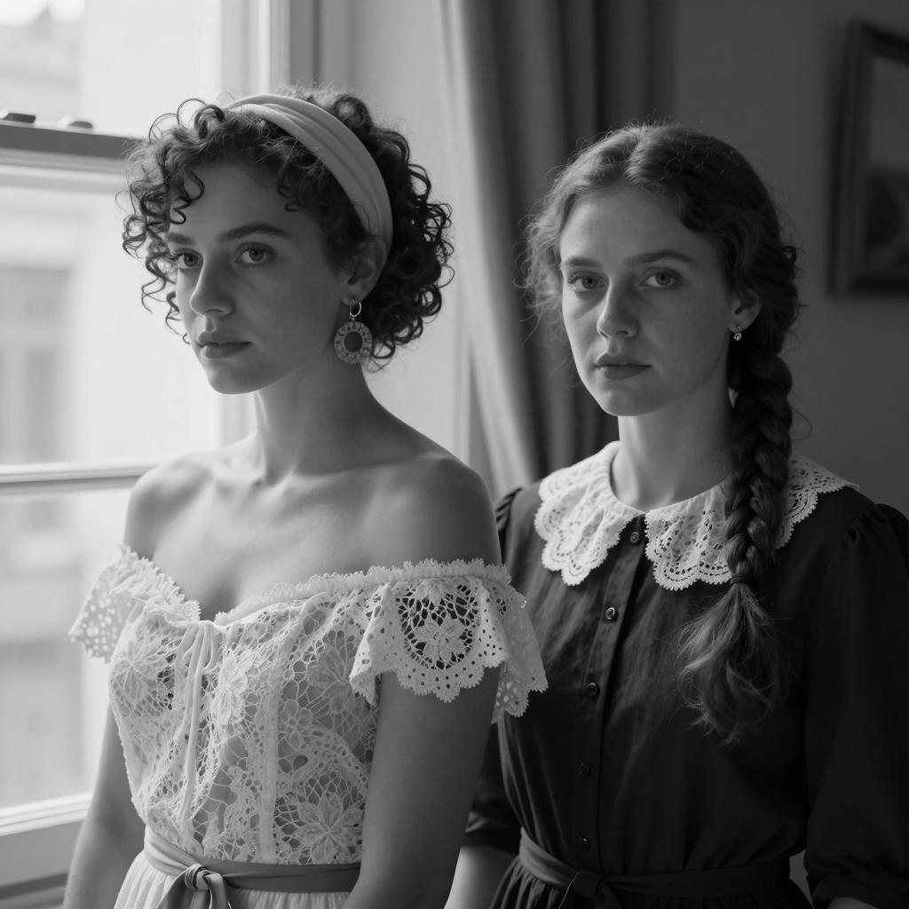 Two women sitting on a bed. The woman on the left has light brown hair in a ponytail, wearing a sleeveless white blouse with lace detailing. The woman on the right has dark brown hair, wearing a black spaghetti-strap top. Both women have fair skin and are looking at each other with intense expressions. The background includes green and red pillows, a white wall, and a striped cushion. They are holding hands.
