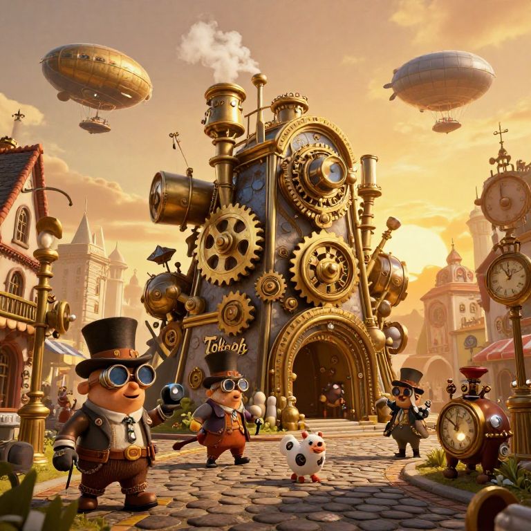 Toktok, a whimsical steampunk city with brass gears and steam vents, bustling with peculiar characters wearing goggles and top hats, under a golden sunset sky with floating airships and clockwork creatures roaming the cobblestone streets.