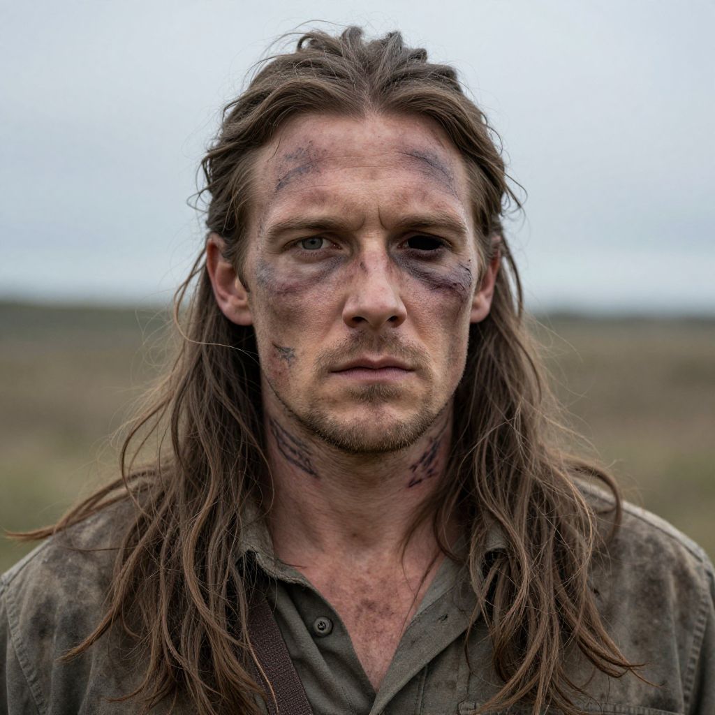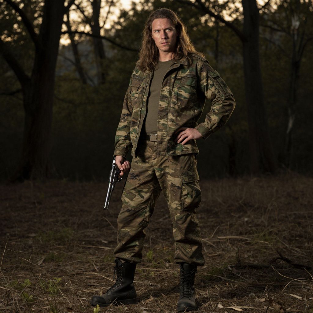 A tall, rugged man with long, wavy brown hair that falls past his shoulders, wearing a faded, well-worn camouflage uniform with a weathered jacket and combat boots. He stands confidently in a dimly lit forest clearing, one hand gripping a vintage sidearm tightly in his left hand, the barrel slightly angled toward the horizon, while the other hand rests on his hip. His intense, weathered eyes gaze forward with a mix of determination and caution, under soft golden hour lighting filtering through the trees. The scene exudes a sense of tension and quiet solitude.