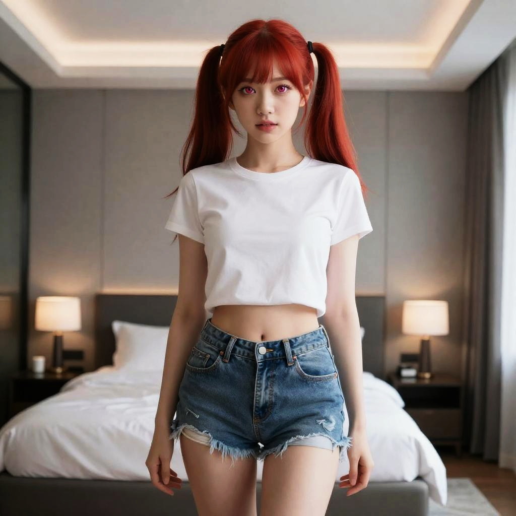 Portrait of a young Asian woman with bright red hair styled in twintails and striking pink eyes, standing in a modern bedroom. She is wearing a plain white cropped t-shirt and high-waisted, distressed denim shorts. The bedroom is contemporary with a neatly made bed, bedside lamps, and gray walls.