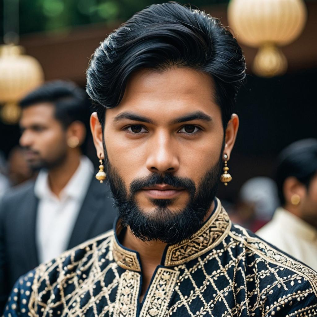 Maharaja groom dress,1boy, male focus, solo, jewelry, facial hair, beard, necklace, outdoors, looking at viewer, long sleeves, realistic