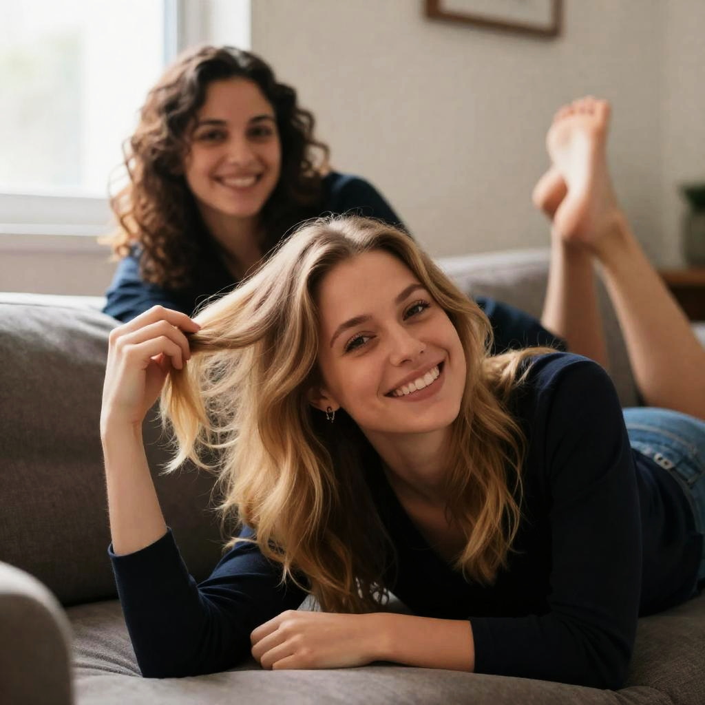 Photograph of two women on a couch. Woman in foreground with blonde hair, dark long-sleeve shirt, smiling, holding hair. Woman in background with curly brown hair, smiling, legs raised, wearing dark shirt. Soft sunlight from window. Casual, relaxed setting.