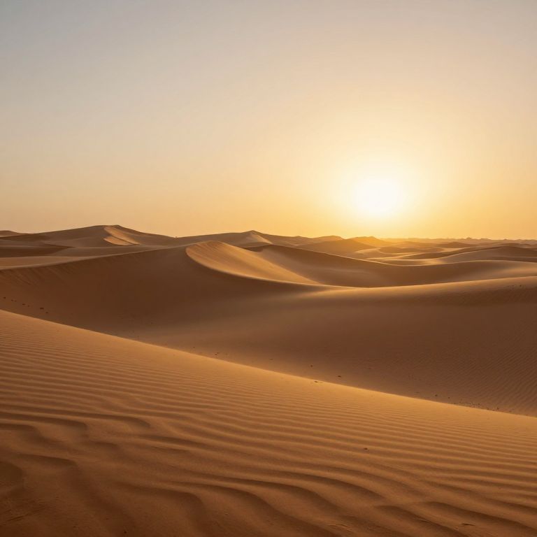 A serene 3D-rendered desert landscape features undulating sand dunes bathed in the warm, golden light of the setting sun, evoking a tranquil yet mysterious atmosphere where the shifting sands seem to whisper the unspoken regrets of passing travelers.