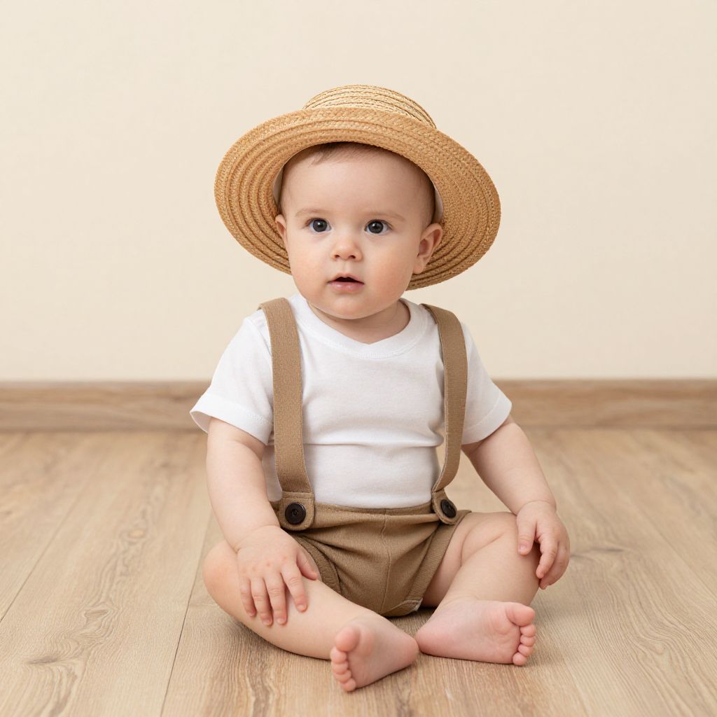 Infant Farmer Costume, baby boy wearing a straw hat sitting on a wooden floor