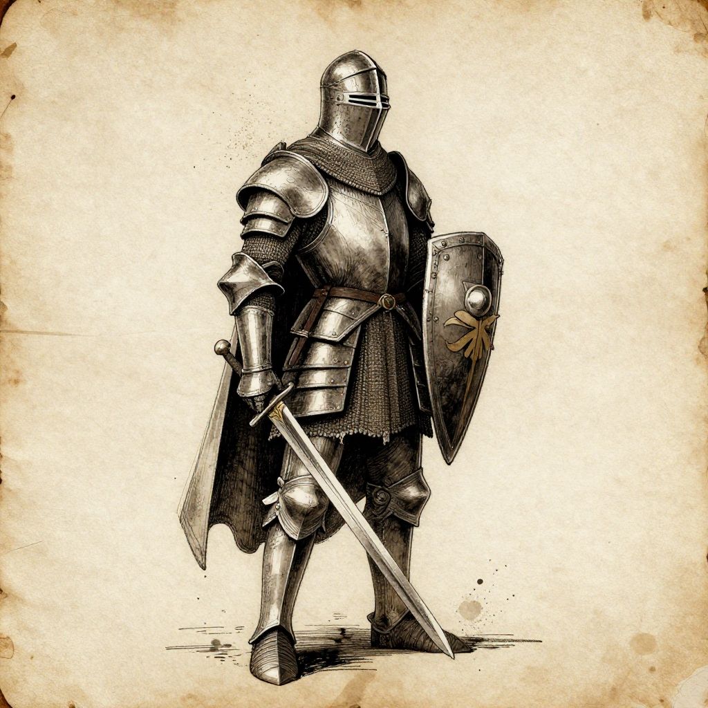 Sepia-toned digital drawing of a medieval armored knight, standing with sword in right hand and shield in left, on aged parchment background.