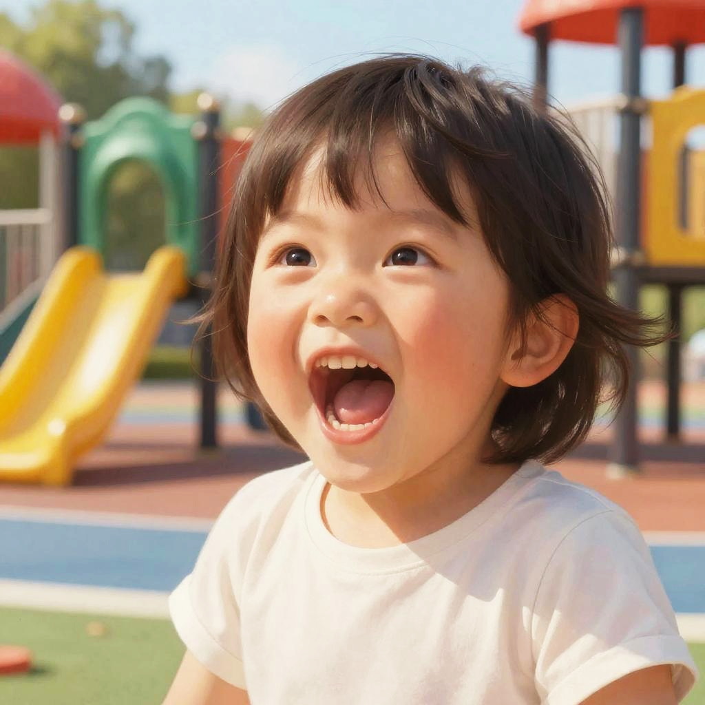 Aah expression on a child's face, mouth agape in wonder, vibrant playground setting, bright midday light, joyful emotion, realistic digital painting style