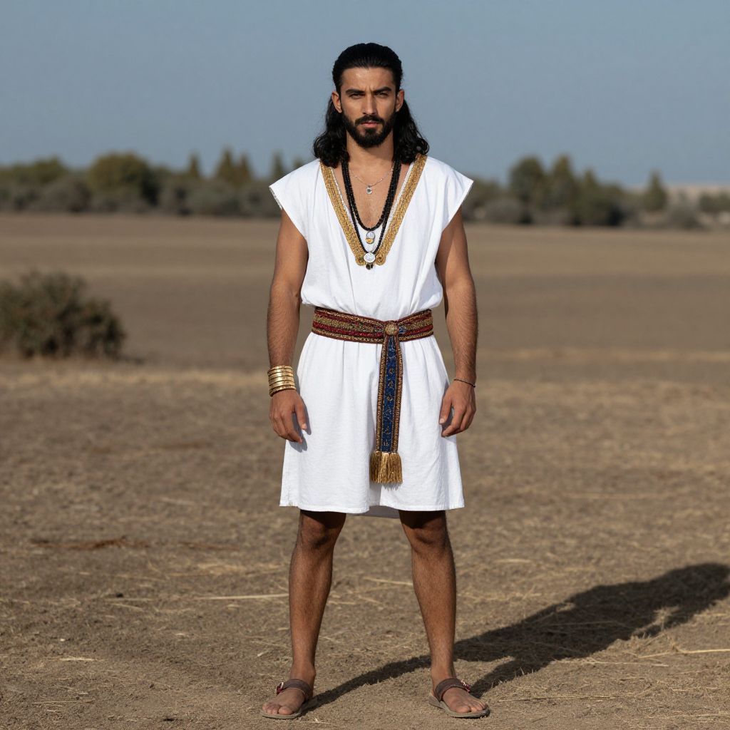 Photograph of a man standing in a dry, barren landscape under a clear blue sky. He has long, dark hair and a beard, and is wearing a white, sleeveless tunic with gold trim and a blue-and-gold patterned belt. His tunic is slightly loose, revealing his muscular arms. He also wears several gold bracelets on his right wrist, brown sandals, and has a serious expression. The background shows a stretch of dry, sandy ground with sparse, distant green shrubs and trees. The man's shadow is cast on the ground in front of him.