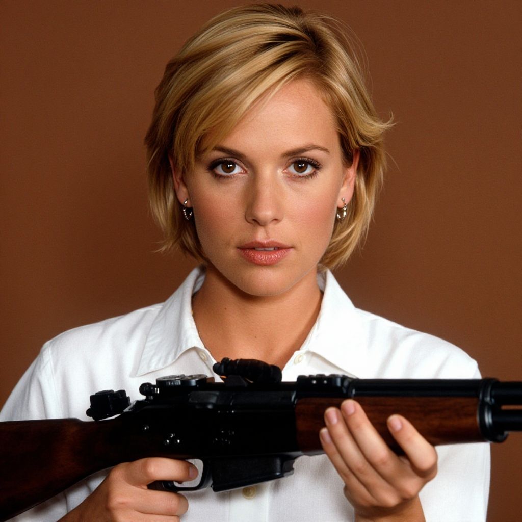 Photograph of a blonde woman with short hair, serious expression, wearing a white shirt, holding a black rifle, against a brown background.