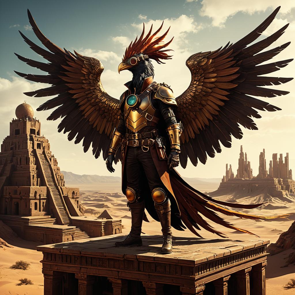 A majestic anthropomorphic bronze phoenix stands atop a floating ancient desert temple, wearing a leather harness and steampunk goggles, cinematic chiaroscuro lighting, digital painting, concept art, artstation, matte finish, sharp focus, illustration, by Magali Villeneuve, Justin Gerard, Aaron Griffin