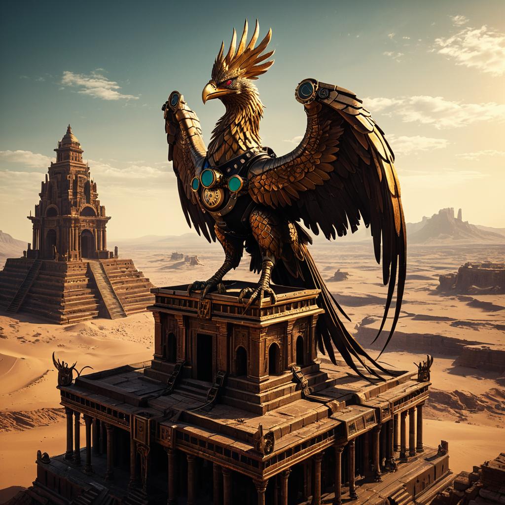 A digital painting of a majestic anthropomorphic bronze phoenix standing atop an ancient, floating desert temple. The phoenix features large, detailed wings spread wide, a fierce red eye, and wears a black leather harness with steampunk elements including goggles and metallic armor pieces. The scene is set in a vast desert with additional ancient temple structures visible, rendered with cinematic chiaroscuro lighting and sharp focus in a matte finish style.