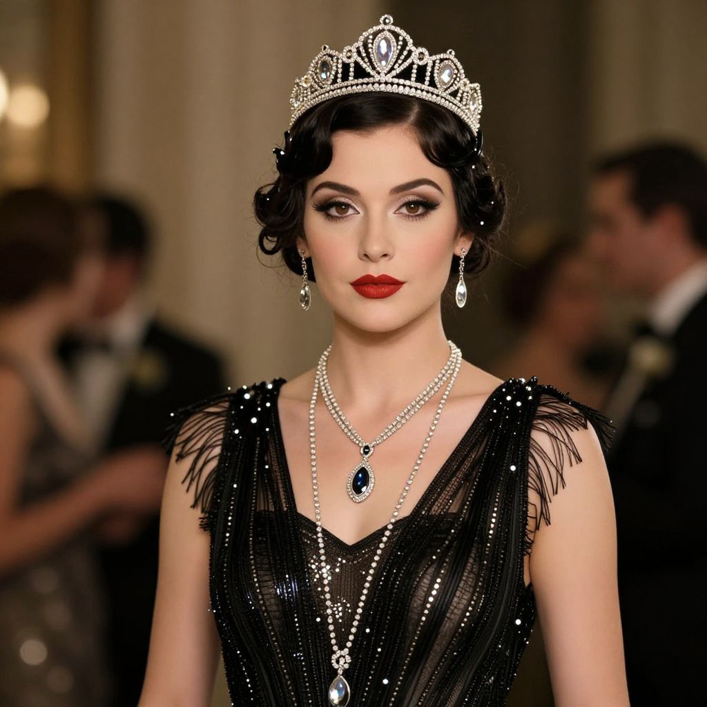 A glamorous, high-definition digital rendering of a woman adorned in a luxurious black dress embellished with sparkling details, complemented by a regal tiara and elegant jewelry, evokes the opulent aesthetic of a 1920s upper-class socialite, reminiscent of the characters in *The Great Gatsby*.