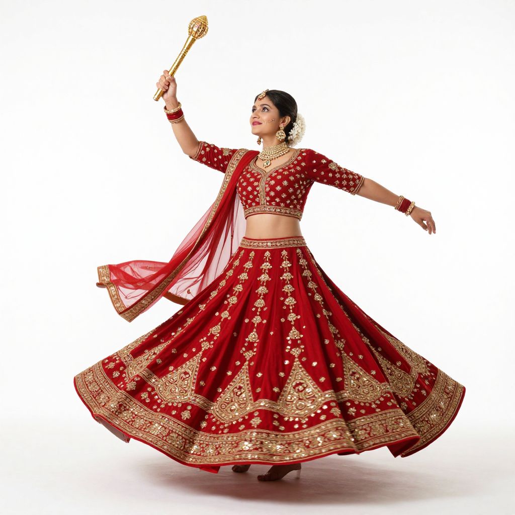 Gracefully twirling a golden dandiya stick, a woman in a vibrant red lehenga adorned with intricate gold embroidery performs a traditional dance, her flowing skirt and jewelry shimmering against the stark white background.