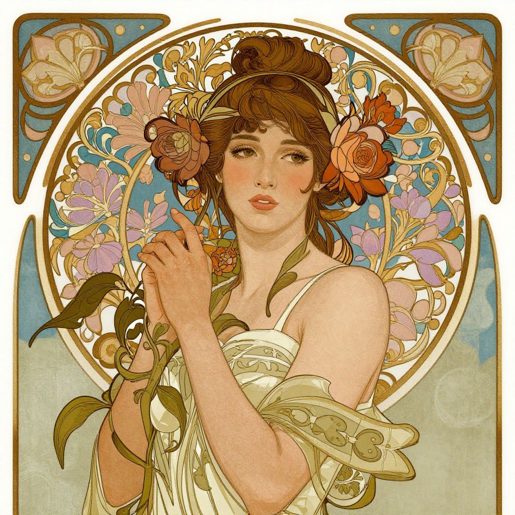 This captivating illustration features a woman surrounded by intricate floral patterns and a serene background. The artwork showcases a fusion of art nouveau and contemporary styles, evoking a sense of harmony and elegance. Rich colors and detailed designs highlight the subject's serene expression and natural beauty.