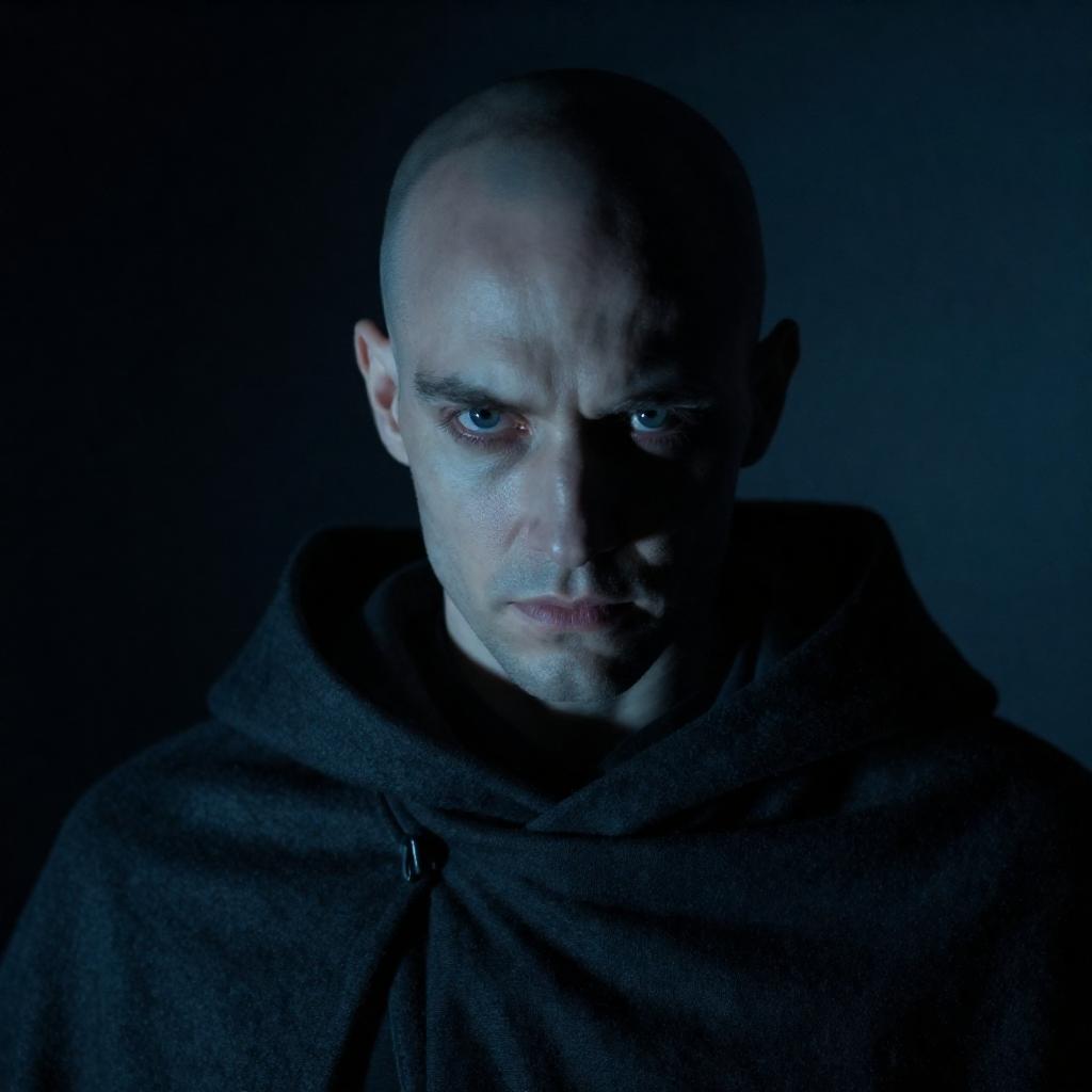 Photograph of a bald man with a focused expression, holding a glass and a bottle, dressed in a buttoned shirt. High contrast black and white lighting, shadowed background, intense gaze, right hand gripping bottle, left hand holding glass.