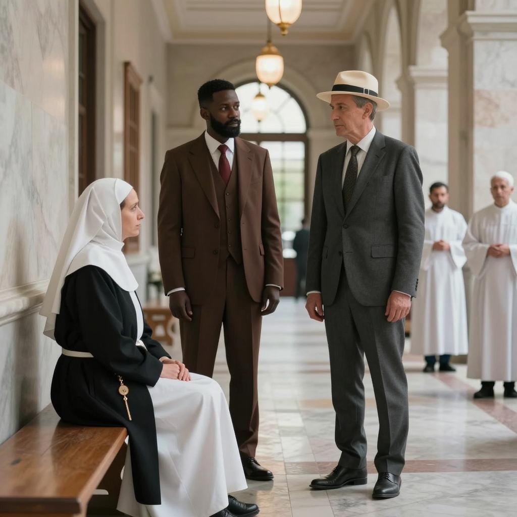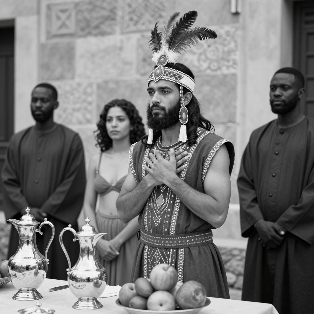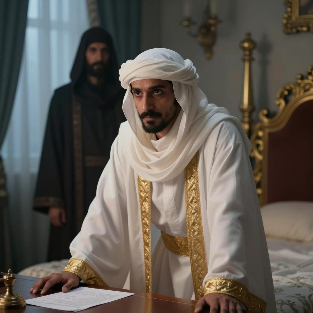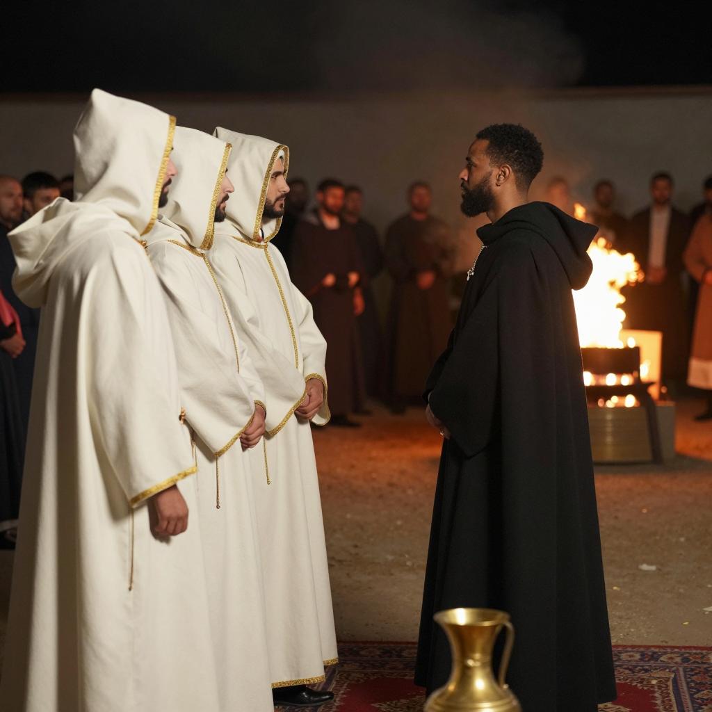 Three men in white, hooded robes with gold trim stand in profile on the left. A dark-skinned man with a beard and black hooded cloak faces them on the right. A brass vessel is in the foreground. Background includes a blurred crowd and lit fires. Men have serious expressions. Nighttime setting. Red patterned carpet beneath.