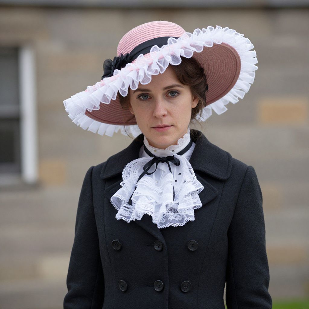 "Victorian Fortune Teller Costume, woman wearing a black coat and pink hat with a white frilly"