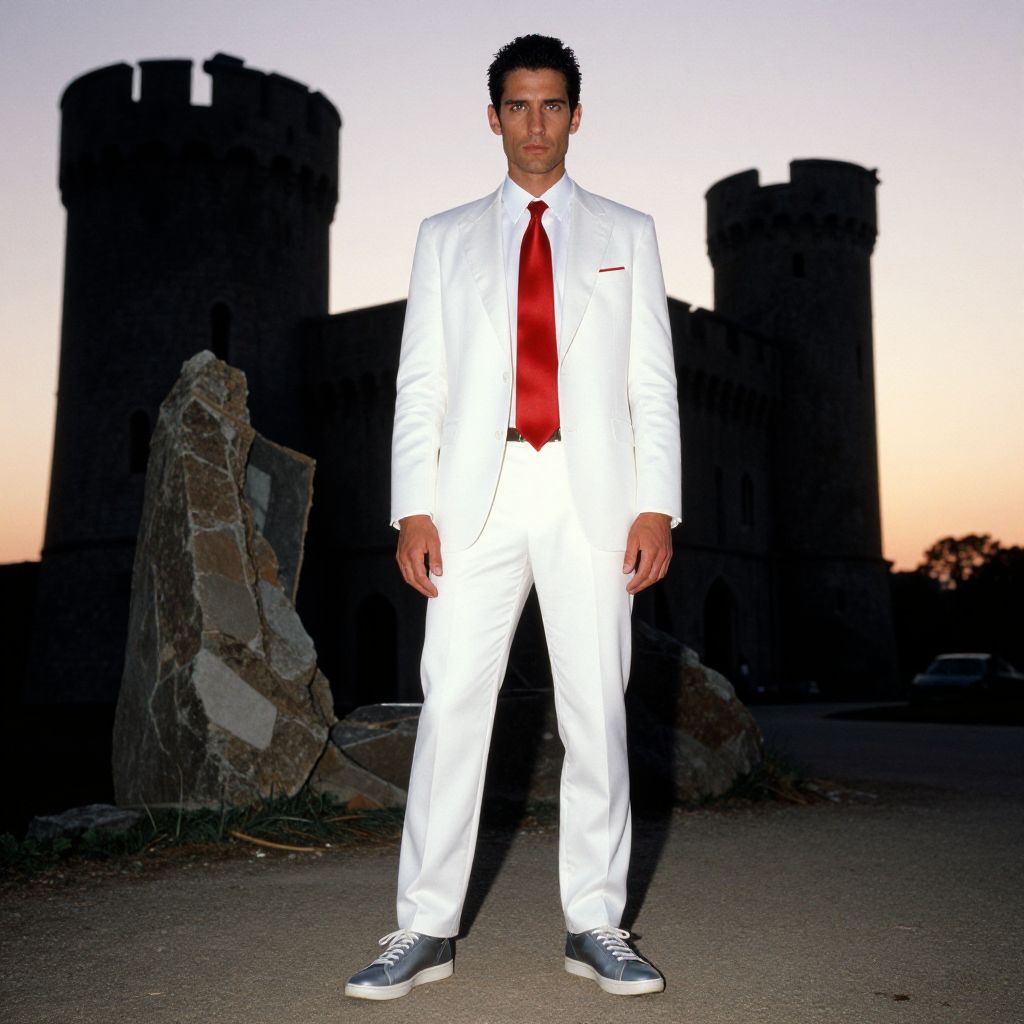 A man, white polyester suit, modern fit, red satin tie, red tie bar, white collared shirt, gray leather sneakers, crumbling castle towers, sunset glow, kodacolor analog film, confident expression Man has masculine face and piercing eyes