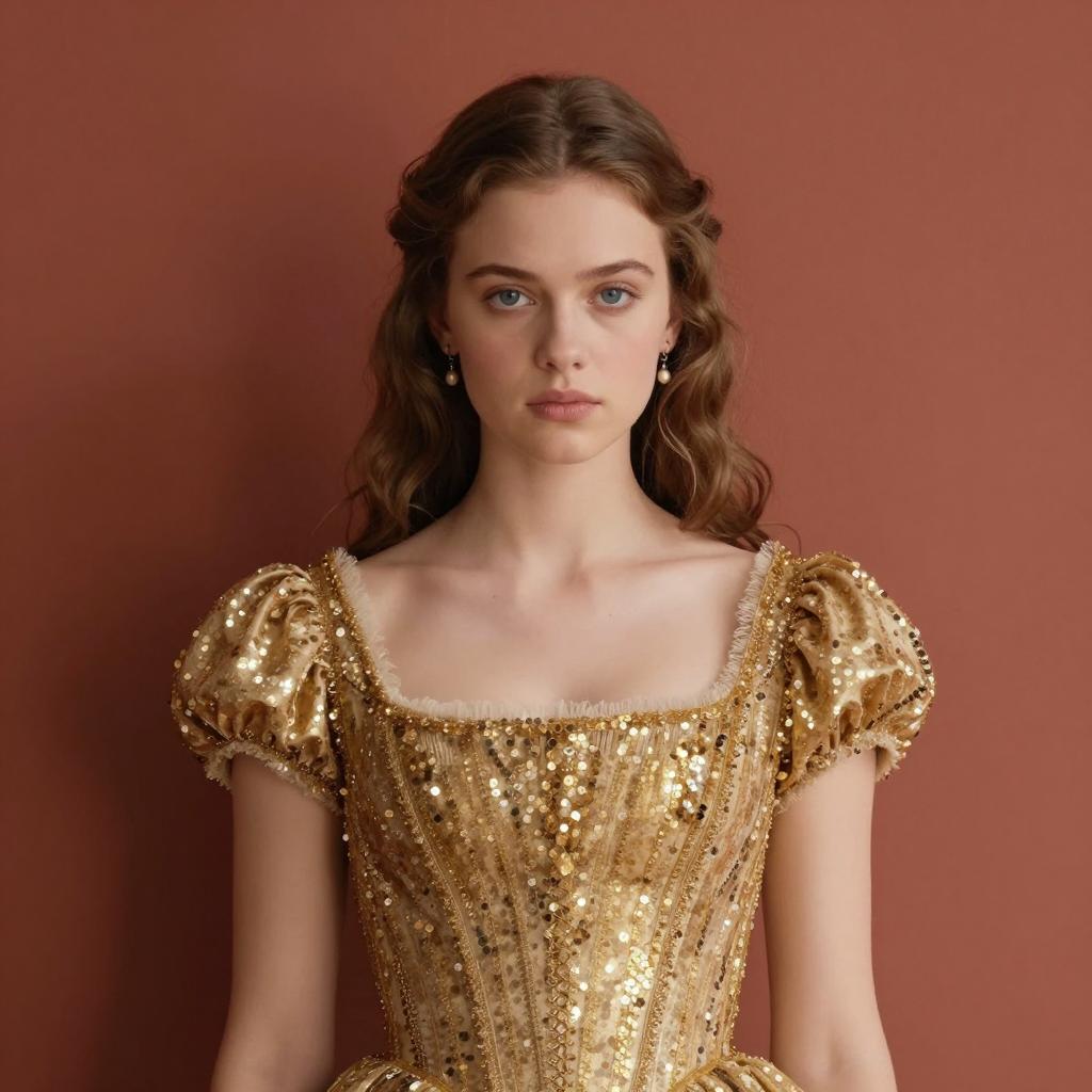 Portrait of a young Caucasian woman with fair skin, brown wavy hair, and blue eyes wearing a golden, sequined, puffed-sleeve dress inspired by Renaissance fashion. She stands against a muted red-orange background with a serious expression, subtle makeup, and pearl drop earrings. The image features soft natural light and realistic shadowing, captured in a high-quality medium shot focusing on her face and upper body.